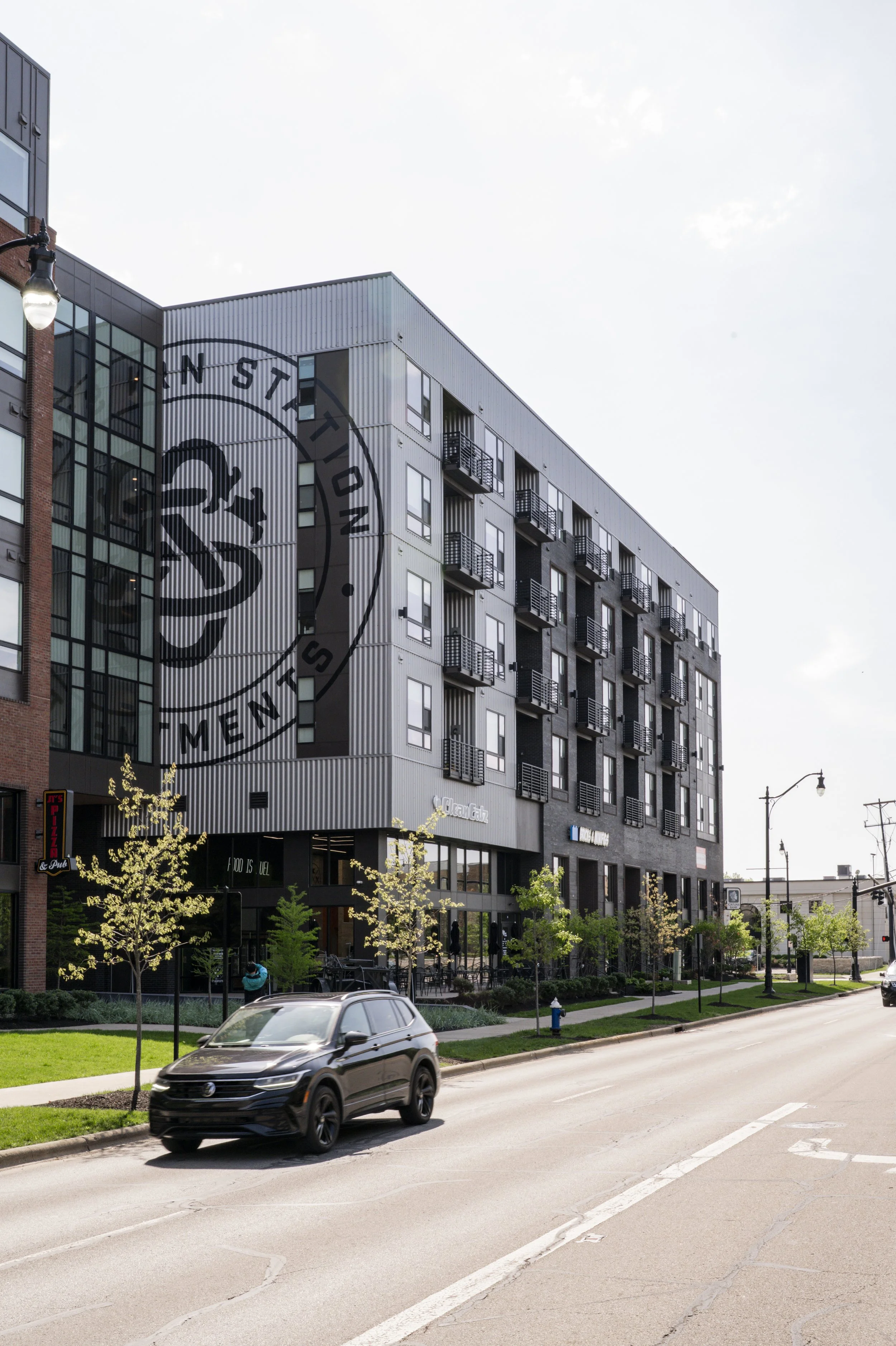 The assistance of littleINDUSTRIES was requested by DayBlink Creative, to help produce three murals on the Southern Station Apartments in Grandview, OH. The largest mural used direct to metal paint on corrugated steel paneling, scaling four stories tall. Two additional murals were added to the building to help enhance the brand.